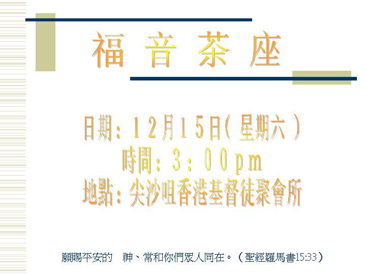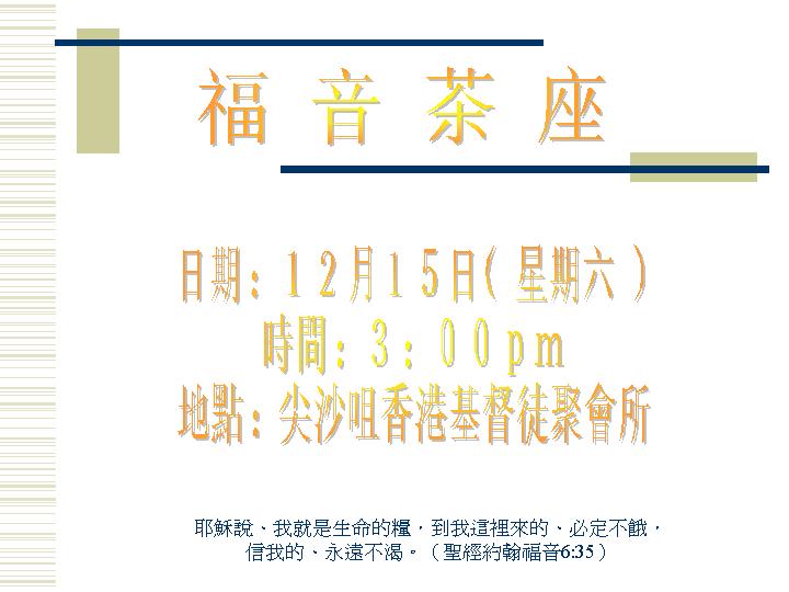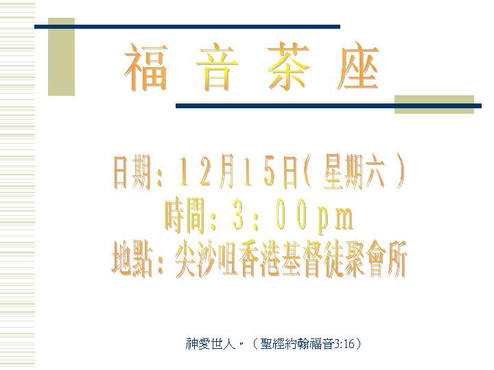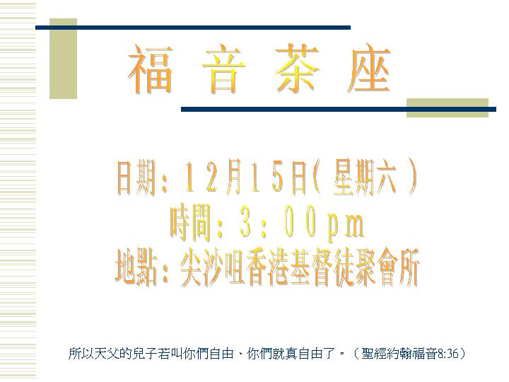 最新消息由十一月起,中青有新面貌。對象收窄到F.1-F.7學生,分為三組:F.1-F.2 ,F.3-F.4,F5-F.7。組長是阿鍵、尚文和祈雯。 What's coming12月22日 大旅行 2:00 pm 金鐘地鐵站恆生銀行集合 12月29日 讀經 1月5日 屬靈交通-見證分享 1月12日 屬靈交通-自由分享 1月19日 詩歌分享 Photo回顧與前瞻 10/11/2001